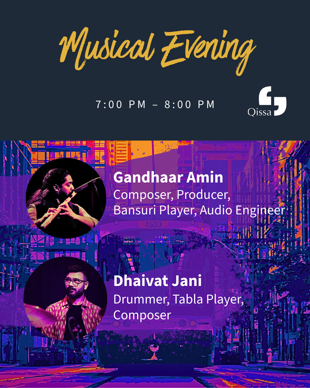 The festival concludes with a live musical performance featuring Gandhaar Amin and Dhaivat Jani. Blending classical training with contemporary interpretation, their work moves across traditions, languages, and diasporic soundscapes. Rooted in migration, memory, and musical lineage, the evening offers a celebratory and reflective close to the day’s conversations.