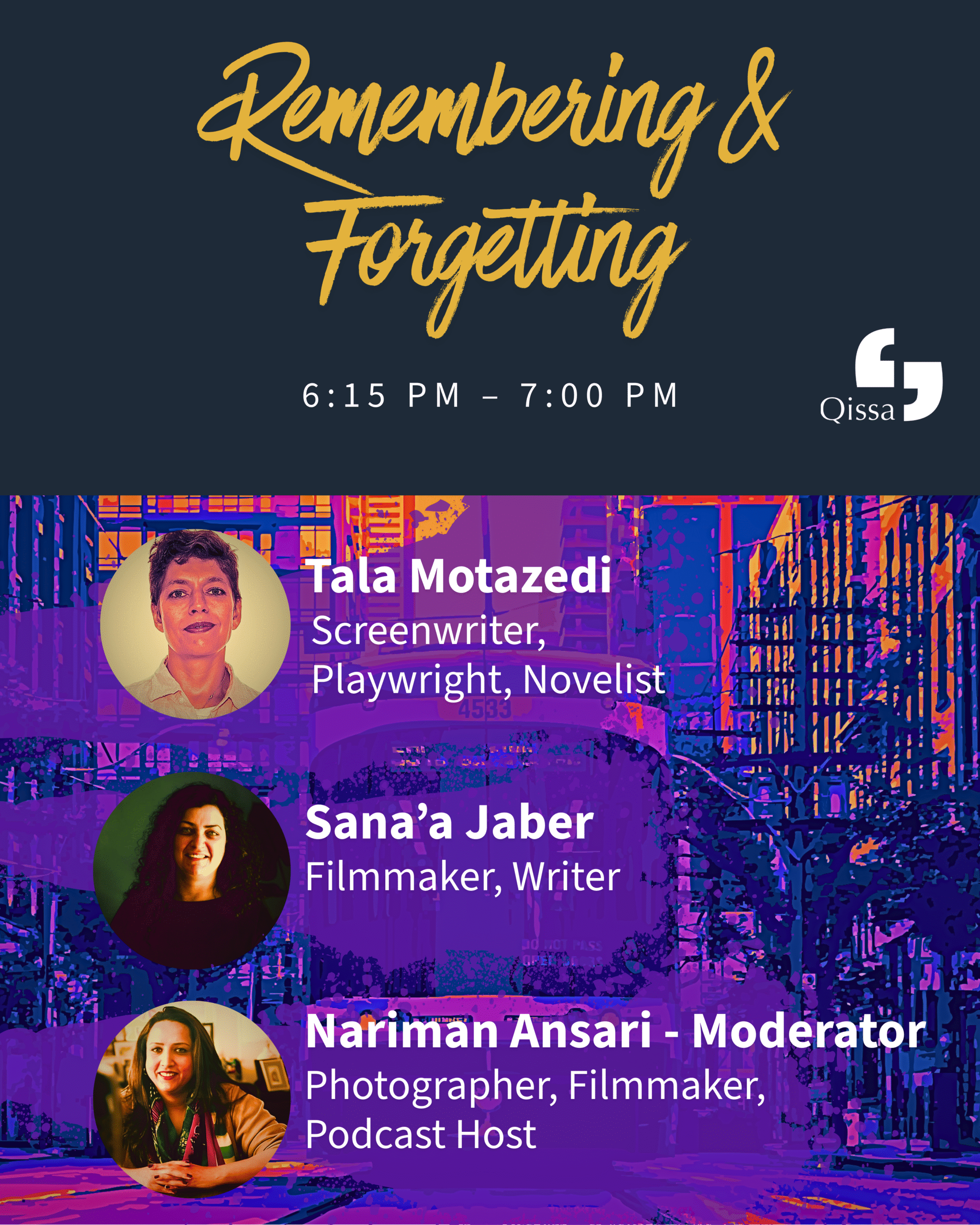 This multidisciplinary performance by Tala Motazedi unfolds through narration, contemporary dance, sound, and projected archival imagery. Centered around a mirror on stage, the piece begins with a century-old family story and moves to the present, tracing the disappearance of a father, and ultimately, the disappearance of the self through migration. The performance is followed by a dramatic reading of writer Mostafa Al-A’sar’s piece, Never Forget What You Are that explores migration as a series of “smaller deaths.” Together, Mostafa and Tala examine disappearance as a condition of migration, followed by a panel conversation with the writers.
