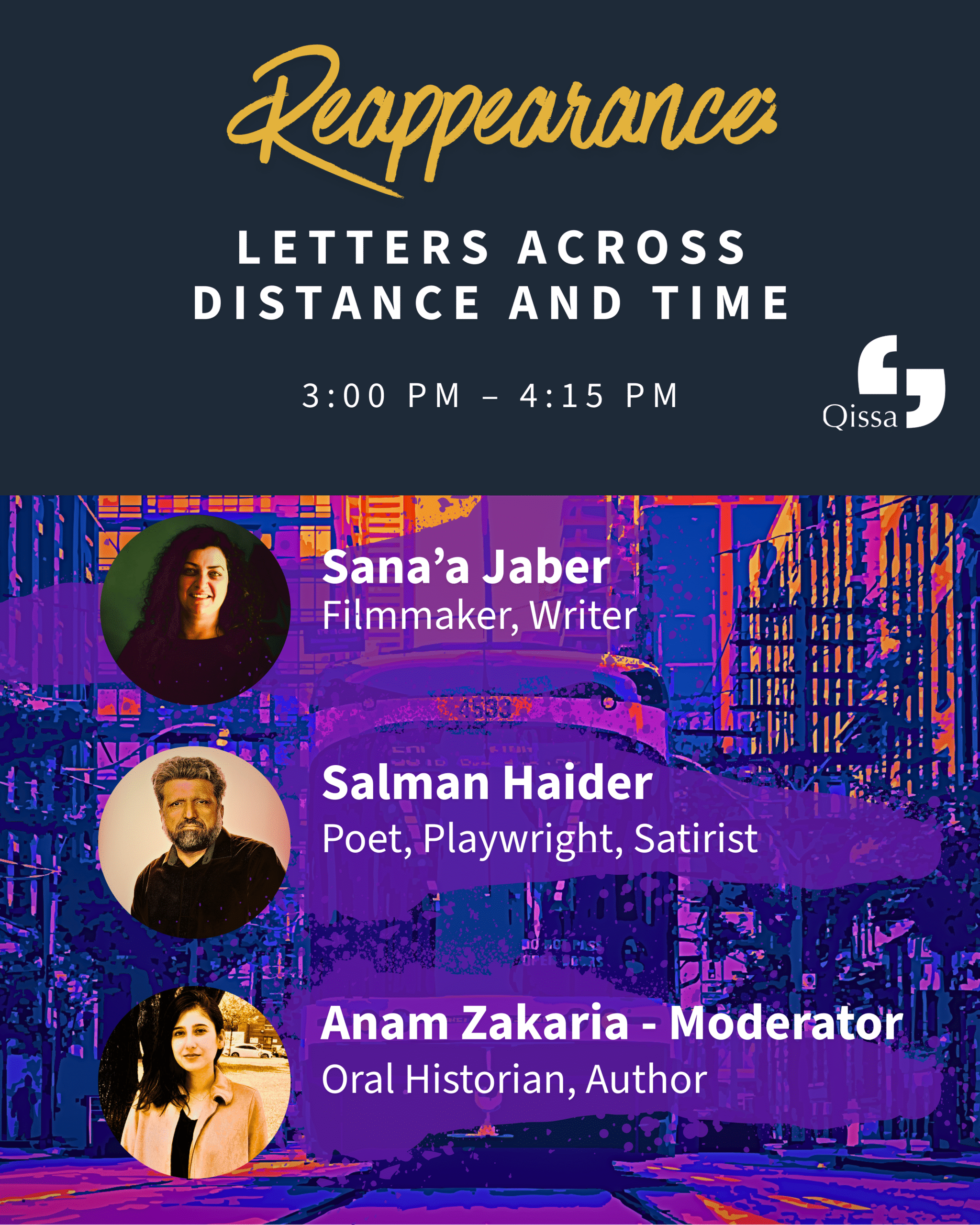 This session opens with a reading by Sana’a Jaber from A Letter to Baba, an intimate reflection on time, distance, and the small details that measure separation. Accompanied by live music, the piece reflects on the quiet transformations that unfold across years of separation. It is followed by a performance by Salman Haider, whose poem After Eight Years traces the fragile encounter of reunion. Through poetry and music, the piece reflects on reconnection after years of separation. The session concludes with a panel conversation.